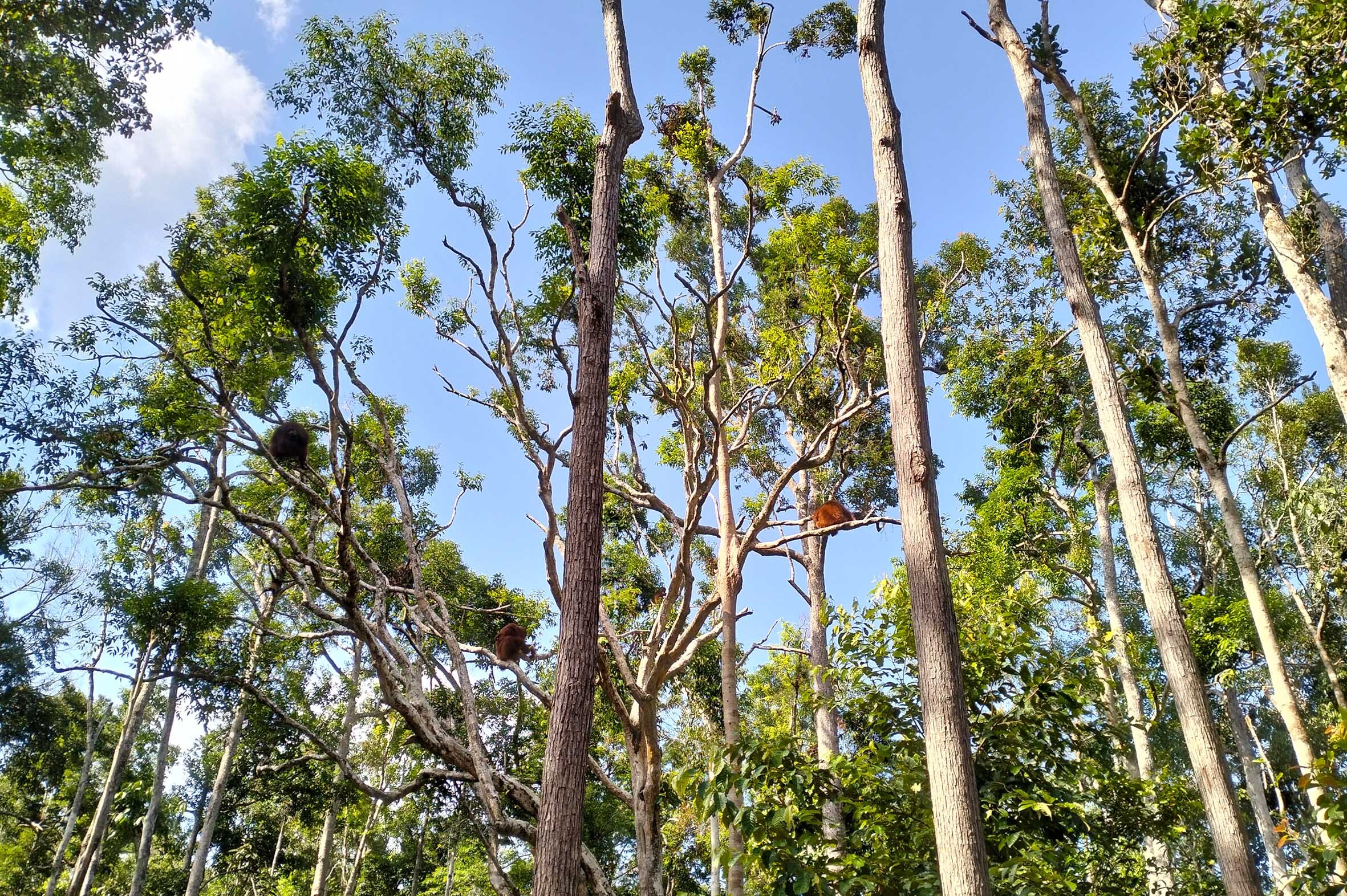 Durant el dia desembarquem per caminar pels senders del parc. Tanjung Puting acull centres de rehabilitació com Camp Leakey i Pondok Tanggui, on es reintrodueixen orangutans rescatats del tràfic il·legal o de zones desforestades per plantacions d’oli de palma.