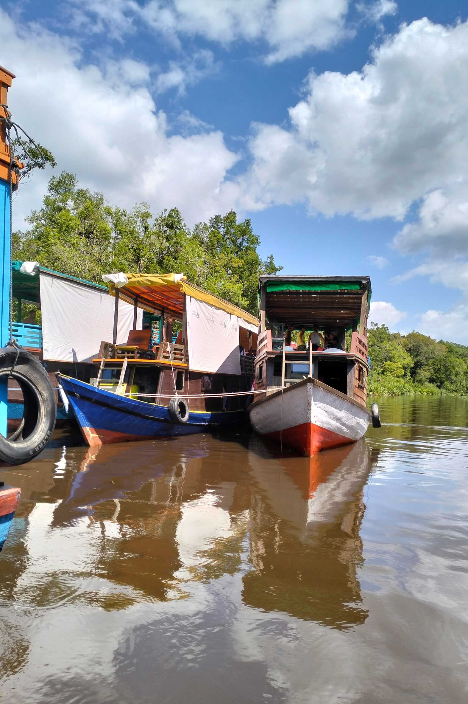 El riu Sekonyer és l’única via d’entrada. Un curs lent, fosc, envoltat per una selva densa que sembla tancar-se a mesura que avancem. Pugem a un klotok, embarcació tradicional de fusta utilitzada per les comunitats riberenques de Kalimantan. Motor senzill, coberta oberta, vida a bord reduïda a l’essencial.