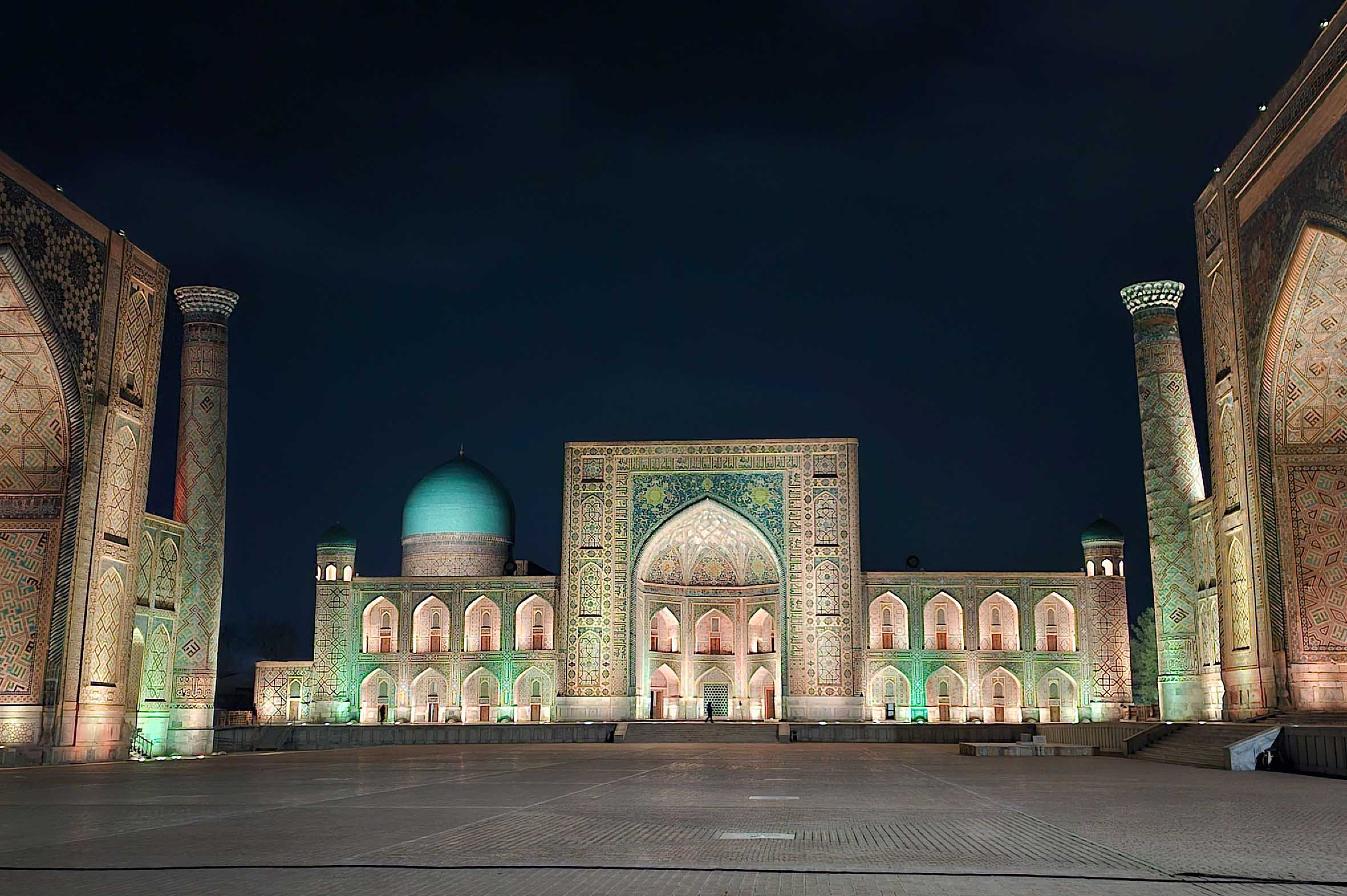 03La majestuositat de Samarcanda assoleix el seu punt culminant a la plaça Registán, on madrasses cobertes de mosaics narren segles d'història. T'allotjaràs al costat d'aquest tresor arquitectònic, per poder gaudir dels seus llums nocturns.