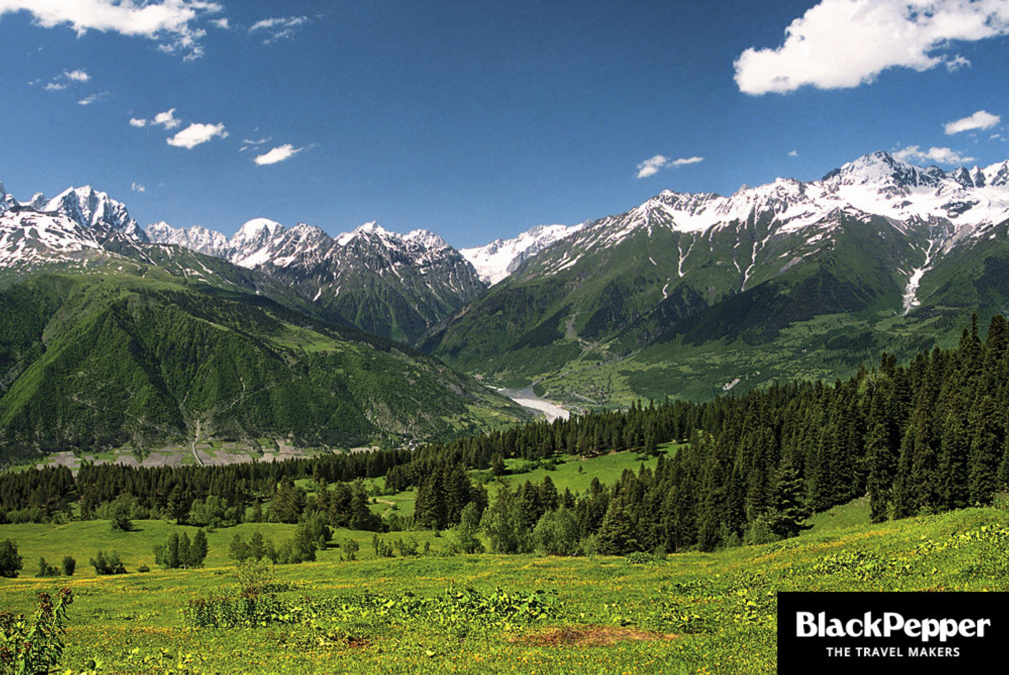 El recorrido nos llevará hasta un punto donde el río corta el camino, para cruzarlo necesitaremos la ayuda de caballos, una experiencia única que añade un toque auténtico a la aventura. Superado este desafío, iniciaremos la ascensión hacia el paso Chkhutnieri, a 2.722 metros de altitud. Desde la cima, se abrirá ante nosotros una vista espectacular de las cumbres que se extienden entre Tetnudi y Shkhara, un panorama que quita el aliento.